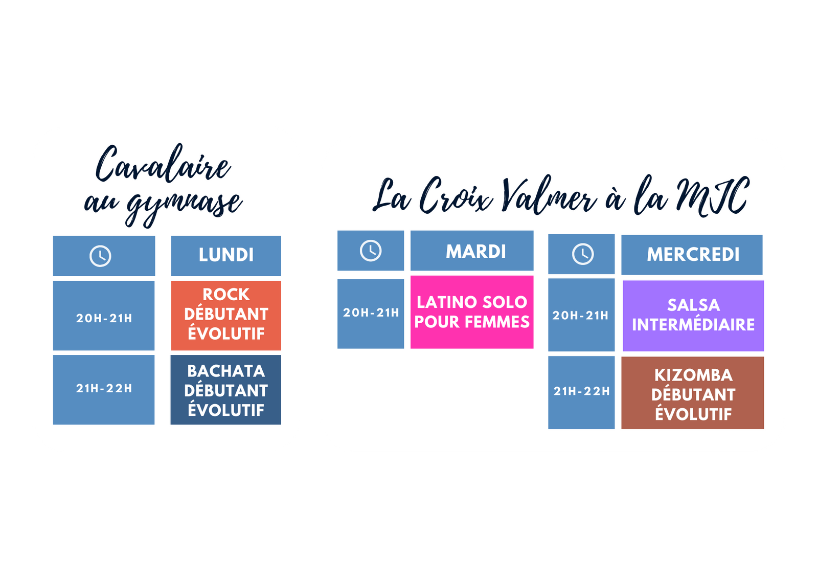 La BACHATA, la SALSA, le ROCK et la KIZOMBA on apprend à danser en couple mais vous pouvez venir solo car on change le partenaire tout au long du cours.